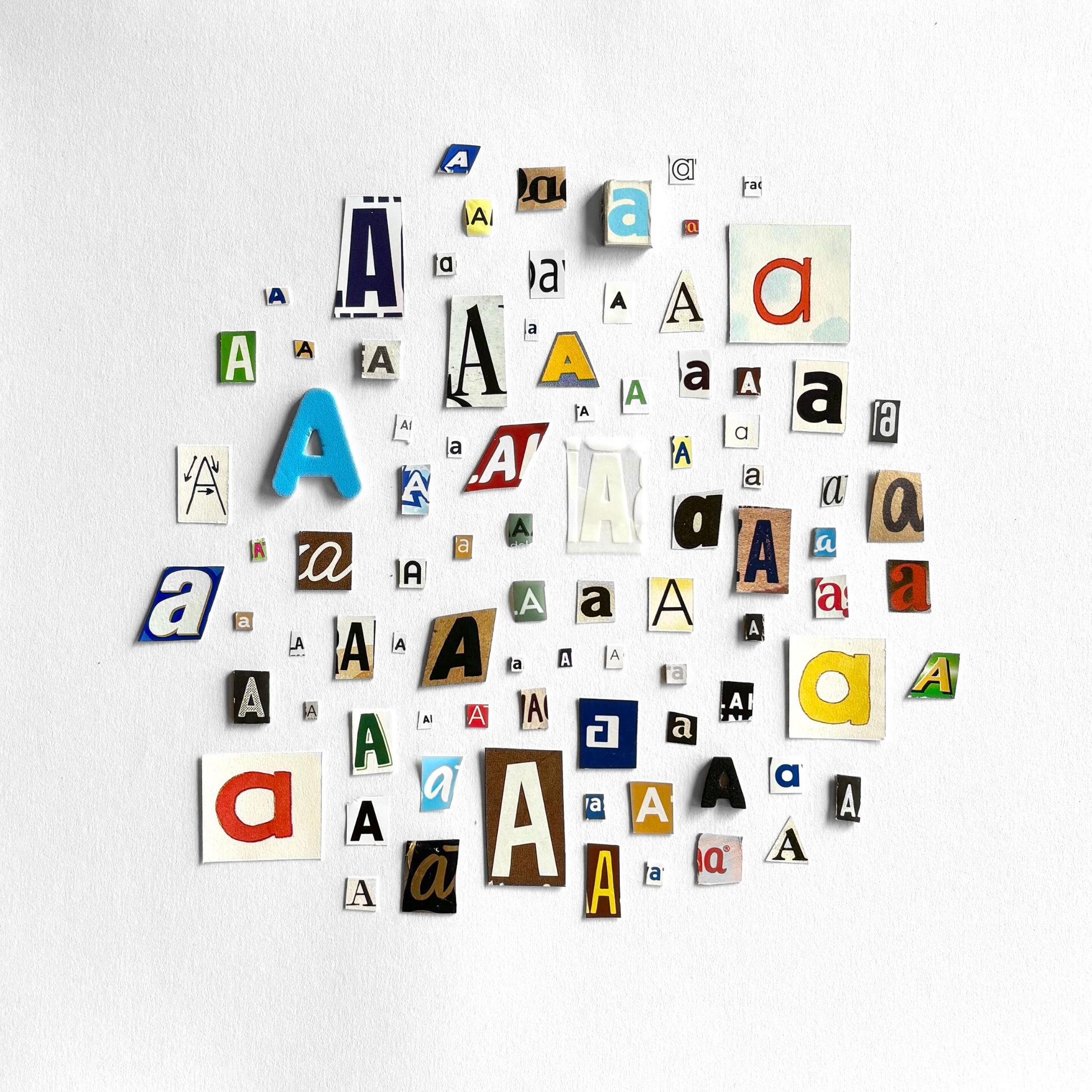 A growing collection of the letter A, carefully cut from newspapers, magazines, packaging, and other found materials. Once gathered, the letters are arranged and photographed as a single composition in my studio. Each time the collection grows significantly, I create a new photograph to document the expanding collection.